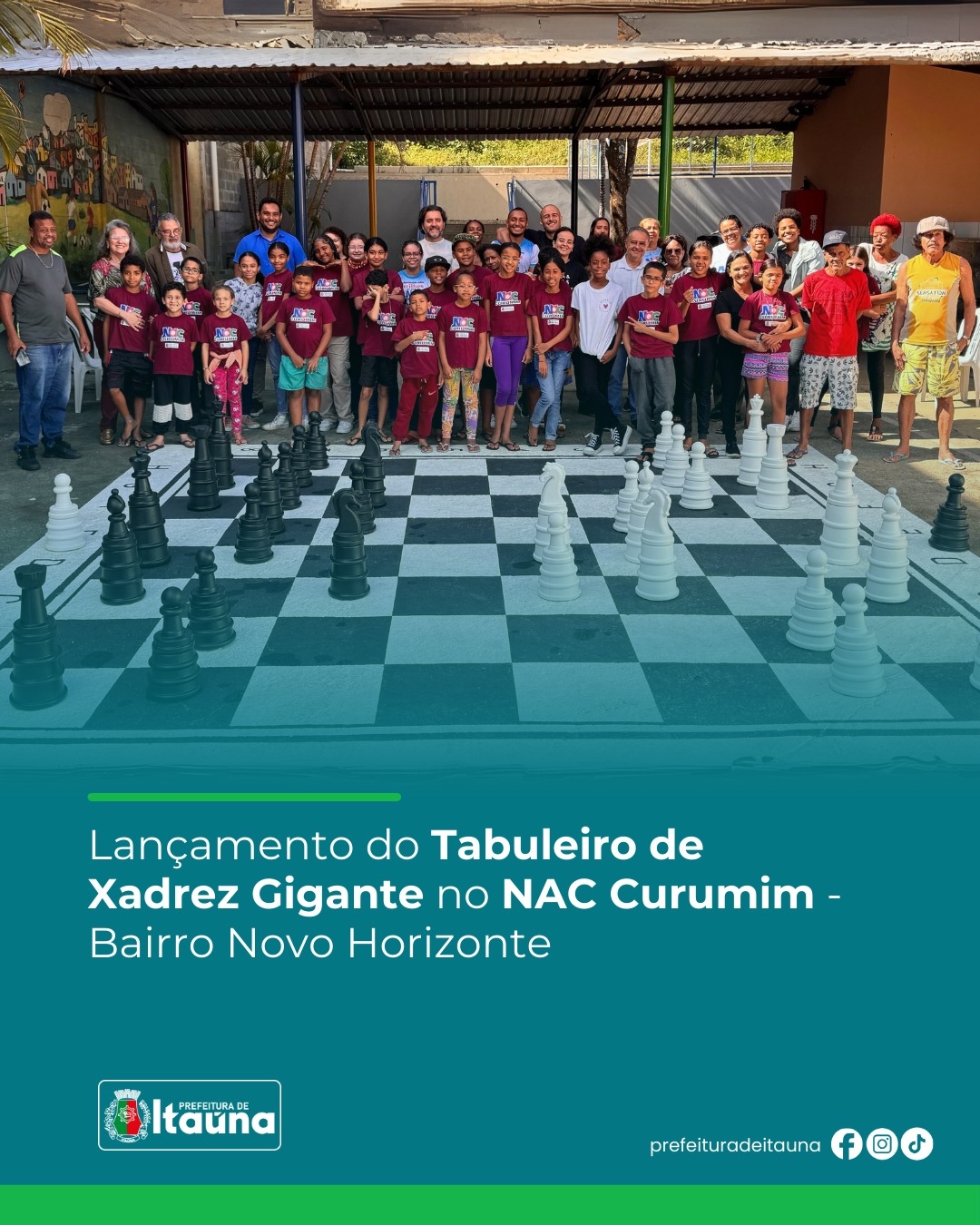 Foi inaugurado o tabuleiro de xadrez gigante no NAC Curumim, localizado no bairro Novo Horizonte. A solenidade contou com a presença dos alunos da unidade, servidores, o secretário de Cultura Marcio Hakuna, o secretário de Esportes Pedro Almeida, a diretora do NAC Curumim, Maria Luiza Vargas, o prefeito municipal Gustavo Mitre e o instrutor de xadrez Marcus Elísio.