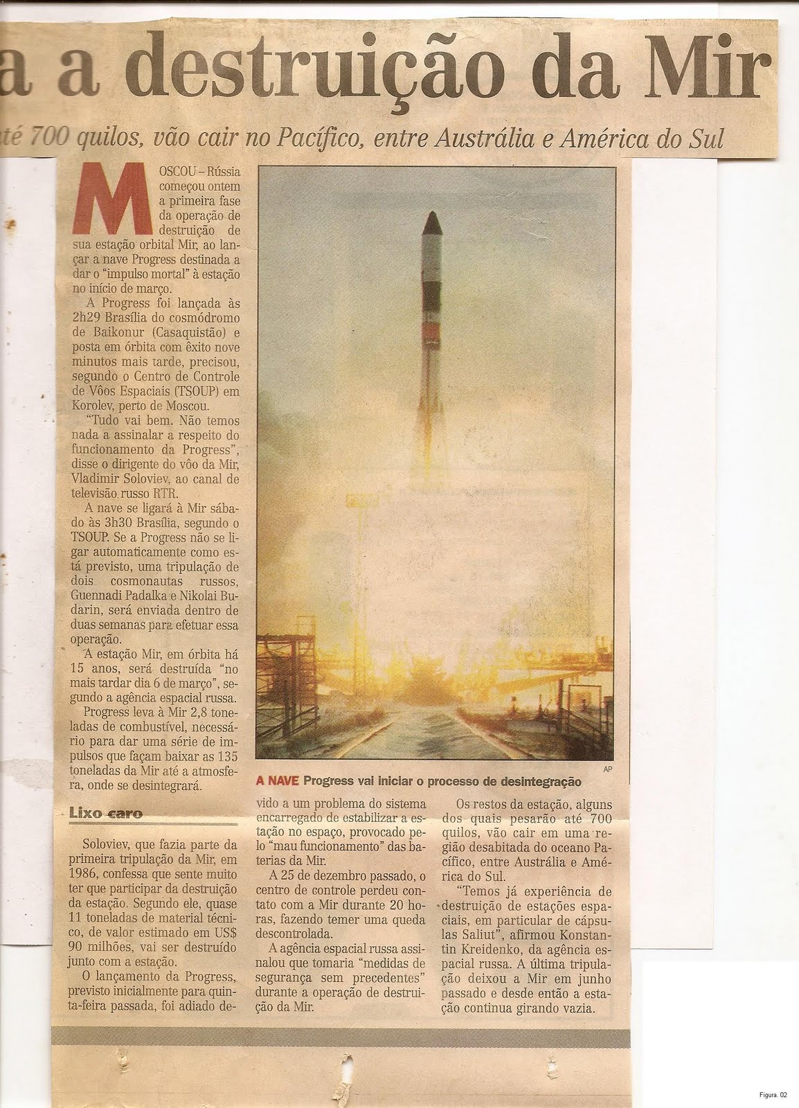 A Mir, estação espacial russa teve queda controlada no oceano, mas partes dela atingiram o território australiano. Clique na imagem para ler a nota