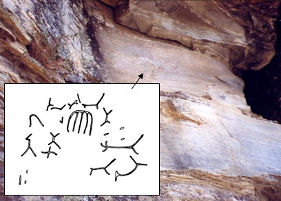 Inscrições no alto da pedra e reprodução das “letras” ao lado.
