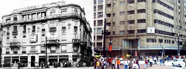 Os prédios antigo e novo da tradicional loja Mappin no Viaduto do Chá com a Praça Ramos de Azevedo.