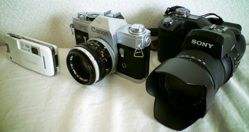 Imagens de três câmeras fotográficas em diferentes estágios de evolução. No início, além da demora na captura, a fotografia digital não alcançava a qualidade das fotos feitas com filme. Leia também: Outros destaques em Via Fanzine