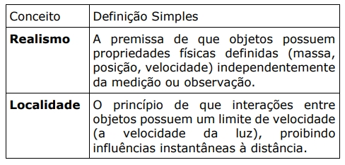 O Realismo Local se apoia em dois pilares: Realismo (objetos têm propriedades definidas independente da observação) e Localidade (influências não viajam mais rápido que a luz).