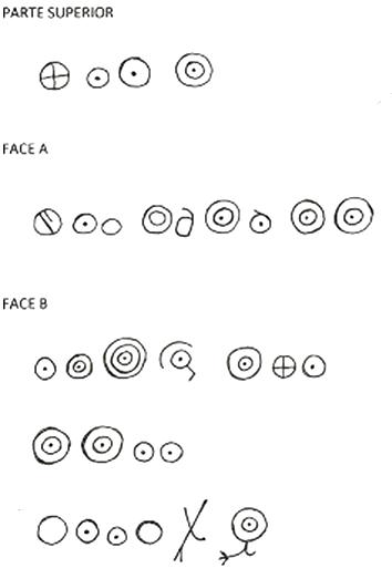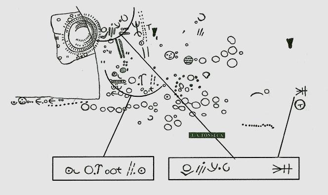 Signos gravados na pedra disforme em Barra do Garças, MT, copiados por este autor e aqui representados como se grafados numa escrita linear.