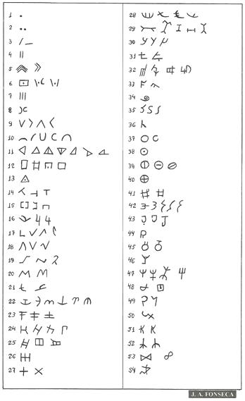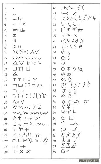 Tabela com 54 signos de Glozel elaborada por este autor, tendo por referência o quadro dos 111 símbolos classificados pelo Dr. Morlet.