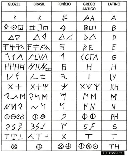 Quadro demonstrativo feito por este autor, mostrando as semelhanças dos signos de Glozel, do Brasil e dos alfabetos Fenício e Grego antigo em relação as suas correspondências latinas.